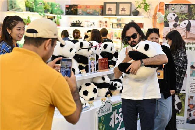 2024年9月16日,参观者在2024年服贸会首钢园区文旅服务专题展区抱着北京动物园推出的大熊猫文创玩偶合影。新华社记者 李鑫 摄