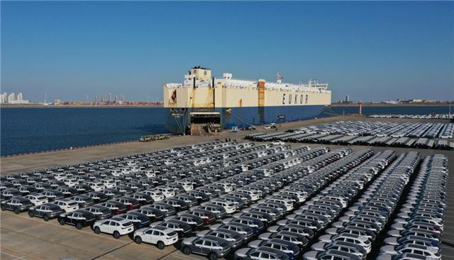 2025年2月25日,来自京津冀地区的超4000辆国产自主品牌汽车在天津港环球滚装码头等待装船发往海外(无人机照片)。新华社记者 赵子硕 摄