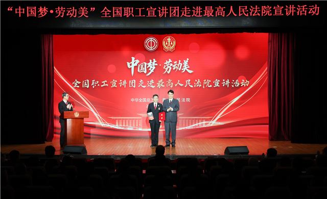 宣讲活动上,中华全国总工会副主席候选人、书记处书记人选、党组成员郑玄波为全国先进工作者、北京金融法院丁宇翔法官颁授“中国梦·劳动美”全国职工宣讲团宣讲员聘书,并赠送书籍《习近平与一线职工朋友们》。