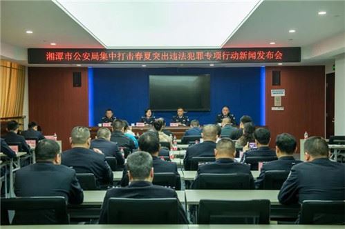 4月26日,湖南湘潭市公安局召开集中打击春夏突出违法犯罪专项行动新闻发布会,湘潭市公安局党委副书记、副局长韩伟专题发布该市公安机关在集中打击春夏突出违法犯罪专项行动的工作情况和相关典型案例,湘潭市公安局刑侦支队支队长陈明君、电侦支队支队长李峰回答中央、省、市新闻媒体提问,湘潭市公安局政治部副主任胡蔚苓主持发布会。