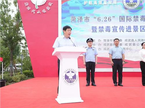 6月25日,菏泽市“6.26”国际禁毒日主题宣传活动暨禁毒宣传进景区启动仪式在成武县文亭湖风景区举办。副市长、市禁毒委主任、市公安局党委书记、局长刘连栋出席活动并致辞。