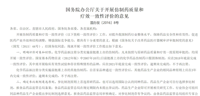 《国务院办公厅关于开展仿制药质量和疗效一致性评价的意见》